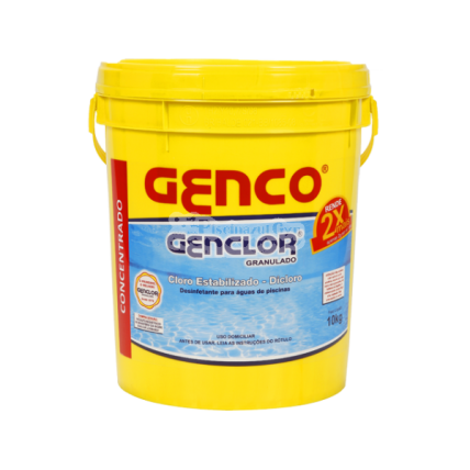 Genclor Cloro Granulado Estabilizado Genco não altera o pH da água, redundando em maior economia. Apresenta alta, rápida e total solubilidade em água, não deixando atrás de si, após sua aplicação, nenhum resíduo insolúvel que possa provocar turvação da água ou sobrecarga no filtro.